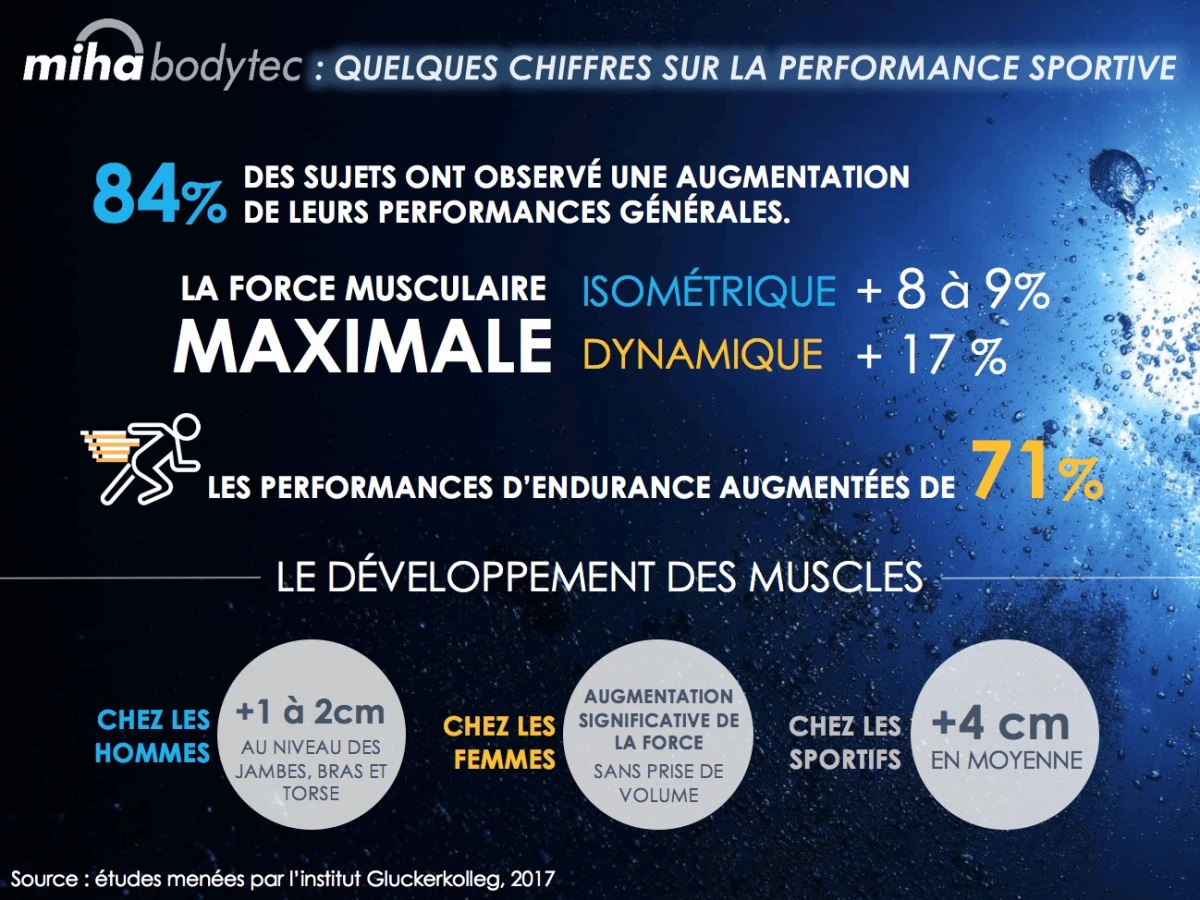 Avec Miha bodytec, leader sur le marché de l'EMS, il est alors possible de travailler 8 zones musculaires en même temps muscles sans stress sur les articulations et en personnalisant l'intensité de la contraction par zone. Ce qui permet d'être accessible à tout le monde quelque soit son âge et son niveau sportif !